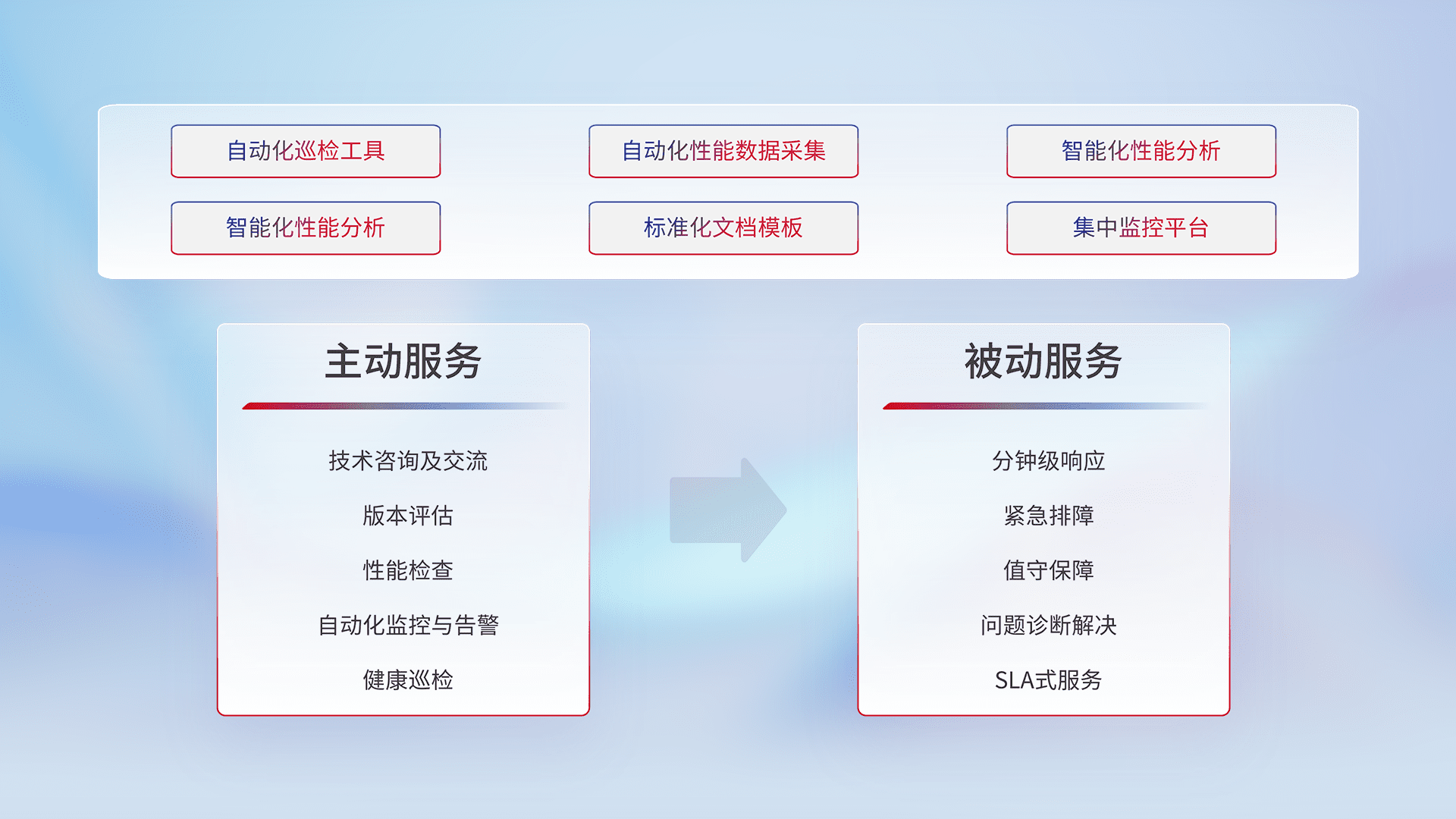 智能化工具和标准化文档,,,保障服务质量,,,,提供主动服务(包含技术咨询、、、、版本评估、、、性能检查、、、、自动化监控与告警、、、、健康巡检)和被动服务包含(分钟级响应、、紧急排障、、、、值守保障、、、、问题诊断解决、、SLA服务)。。